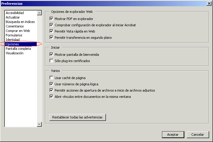 Luego de instalar el Acrobat Reader 5.0 o superior debe ejecutarlo y adjustar su configuración de la siguiente manera: